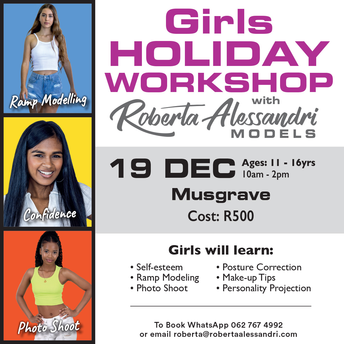 Terms and Conditions: (1.) Roberta Alessandri will place photos and videos of the girls taken during class on social media. (2.) Roberta Alessandri does not promise that your daughter will become a model during or after this course. (3.) Roberta Alessandri has the right to cancel this course for any unforeseen reason and a full refund will be given to the person who has paid for the course. (4.) Roberta Alessandri has the right to postpone the course due to unforeseen circumstances. If postponed for more than 2 weeks a full refund will be given to the person who had paid for the course. (5.) Wear comfortable clothing but always look good. No slops or slip on shoes as it is difficult to walk in these. No stiletto heels. (6.) After completing this 5 week beginner course the girls can join the once a month model club which is a class on a Saturday once a month. This improves on whatever they have learnt during the 5 week course.