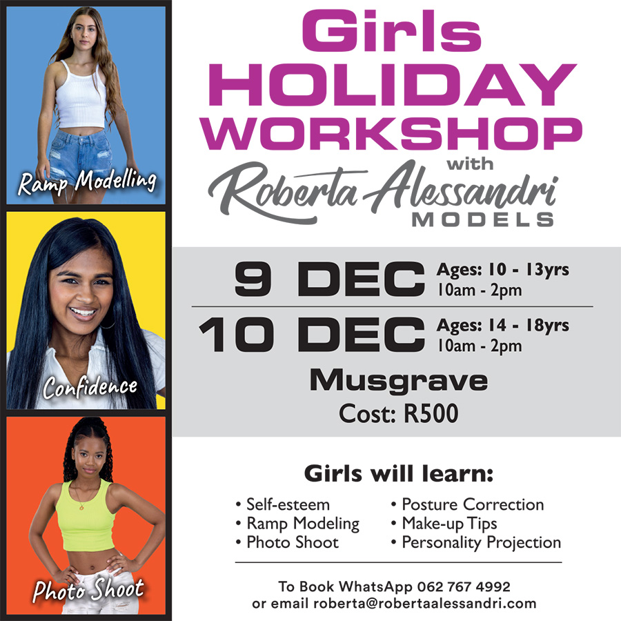 Good day. It will be my great pleasure to guide your daughter on this course where I will endeavour to improve her self-esteem and self-love of herself. I have only success stories of girls who have grown in self-esteem and confidence. Girls who have done this course to become models and girls who have just done this course for fun and to build confidence. Friendships have been made and lasted during these courses between the girls. After this course she can join my model club where she can continue to come to classes once a month to even improve more. I do hope that you will send her on this wonderful journey of self-improvement. Please look at my website to read testimonies and for other information.